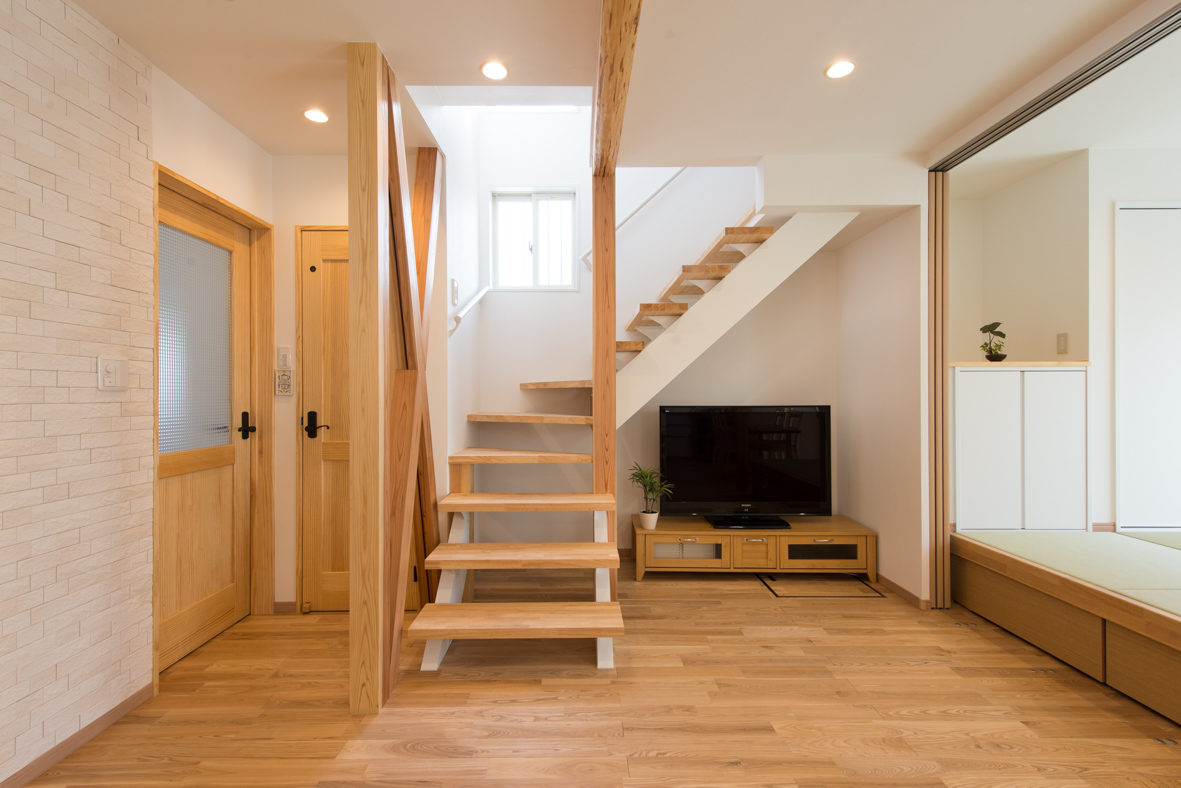 間取り変更に伴い、架け替えた階段です。 開放感が出るよう、大工さんがスケルトン階段を手作りしました。職人の技が光ります。