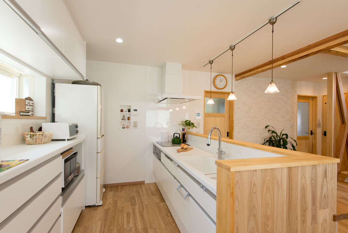 システムキッチンはパナソニックの「ラクシーナ」。インテリアの主役である自然素材と衝突しないよう、キッチンは白でまとめました。 背面にはカップボードと家電収納庫を設けました。 カウンター上部にはペンダント照明を3つ取り付け、ポップで可愛らしい雰囲気です。