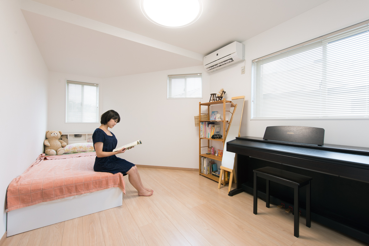 リビング隣に設けた小上がり和室は、下部を引出収納にすることで空間を有効活用。 サッシ位置の工夫や採光パネル仕様の引戸にすることで、和室からの光がリビングにも届きます。