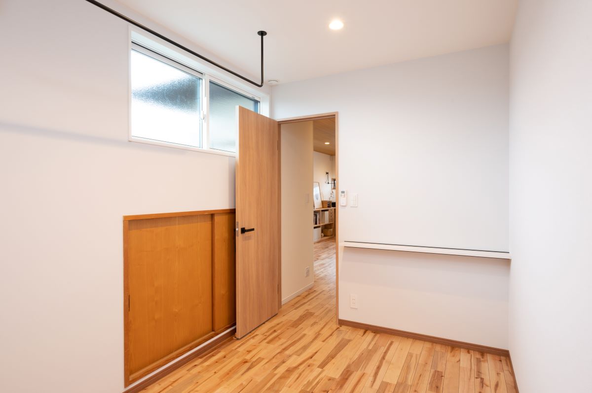 普段は収納として利用する部屋。 天井にはフックを取り付け、屋内干し時に便利です。